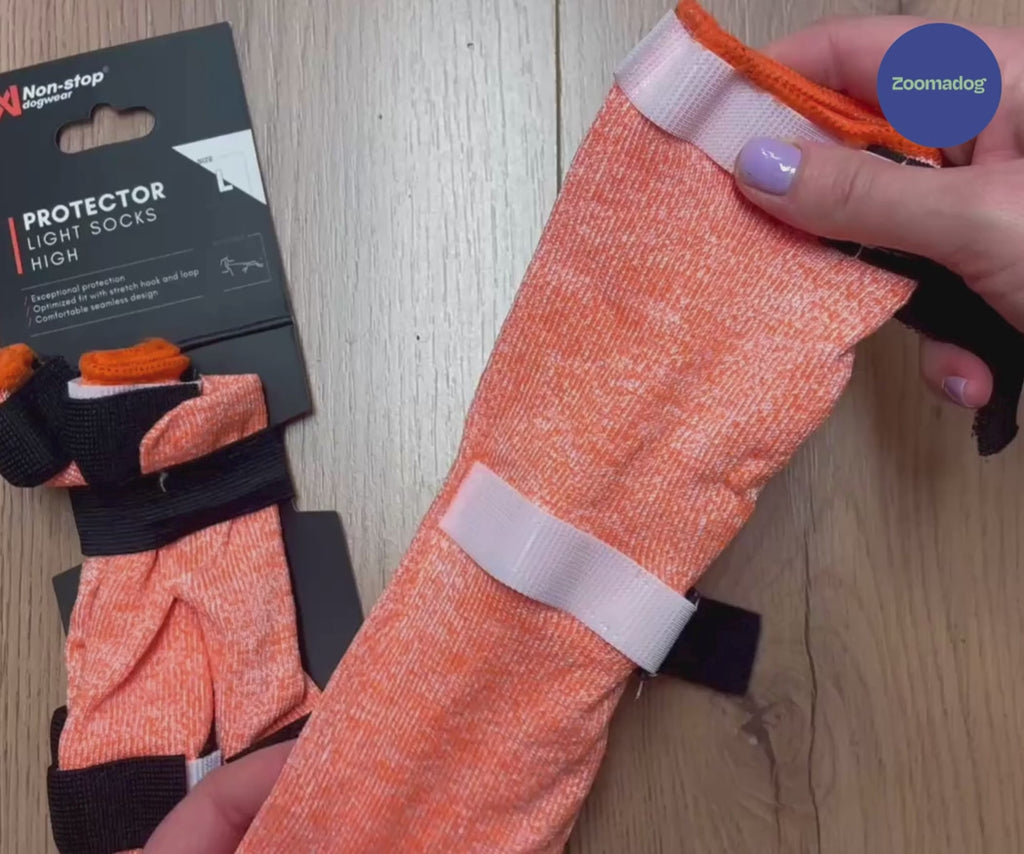 Non‑Stop Dogwear Protector Light high Dog Socks are excellent for giving your dog elevated, breathable paw and lower-leg protection without weighing them down on everyday walks and outdoor trips. These extra-long protective socks are made from cut-resistant, open-knit fabric that helps shield your dog’s paws and lower legs from rough ground while still letting their paws expand and move naturally, so your dog stays comfortable step after step. Elastic hook-and-loop closures help keep them snug and secure through all kinds of terrain, and their lightweight design makes them easy to put on and easy for your dog to wear on longer strolls. Sold as a set of four so all paws and lower legs are covered, they’re a practical, everyday way to support your dog’s paw health and confidence in varied conditions.