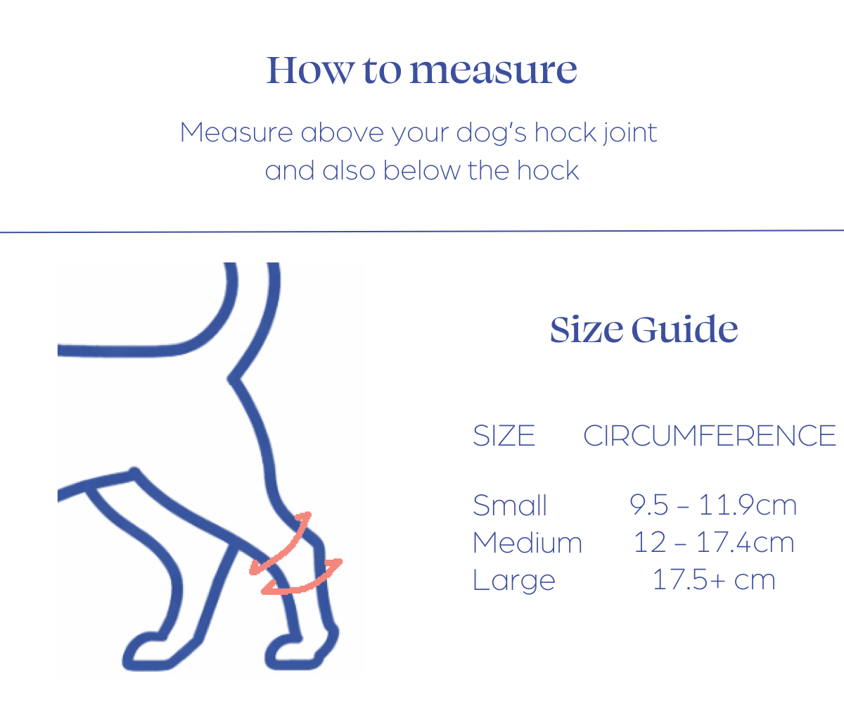 You need to measure two points: below the hock joint (the pointy joint on your dog's back leg) and your dog's paw width.
